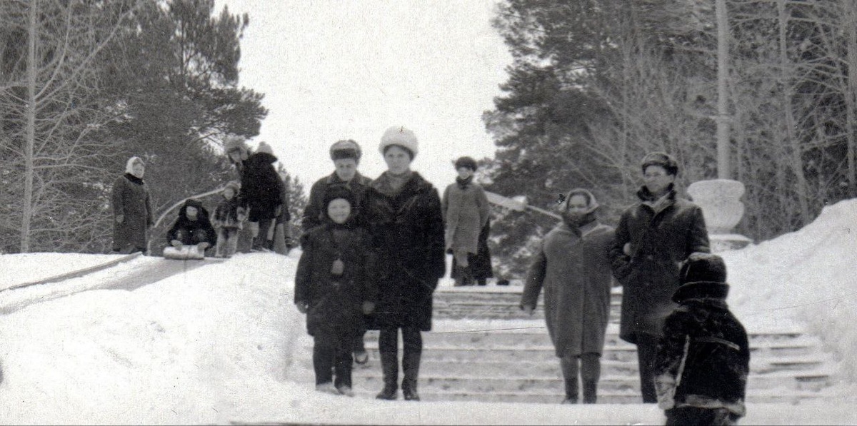 1968/69 год. Наша Главная лестница в парке во времена активного использования "под горку" в зимнее время. Фото из фотоархива Сергея Тарасуна Автор Михаил Васендин