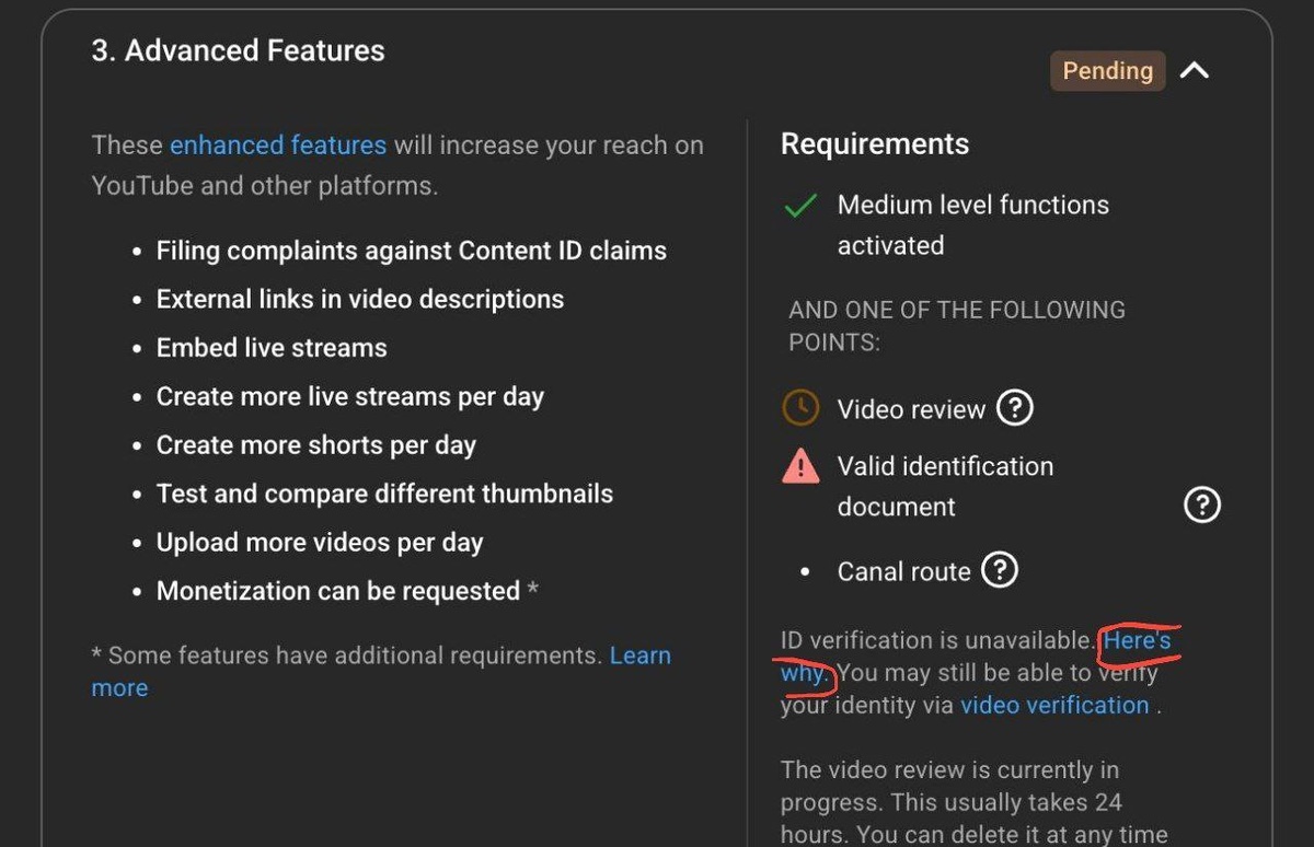 Напомню о моих ещё летних постах о функциях, где я писал об этом списке стран. Я также писал о том, что риски проблем с аккаунтом повышаются от использования всего, что относится к подсанкционным странам, в частности, от исп-я номеров. Не так давно эта инфа начала распространяться и я хотел бы поделиться интересным наблюдением. ➡️Вышло кстати так, что я за полгода предвосхитил тренд на теоретические тонкости, в том числе на идею, что блогерам с беляка надо разбираться и в "серячном", в "платформенной части", во всяких антиках и т. д., что и подтвердилось после декабрьских и январских блокировок и демонетизаций. ➡️На одном из моих каналов с продвинутыми функциями следующая ситуация: они на бесконечном рассмотрении при отключенном бренде (скрин 1), и без лица/документов при включённом (скрин 2). Я нажал на ссылку и оказался на странице подтверждения функций. ➡️По тому, что выкатил вам гугл при переходе, можно понять, знает ли он о том, что ваш аккаунт связан с IP из списка подсанкцион