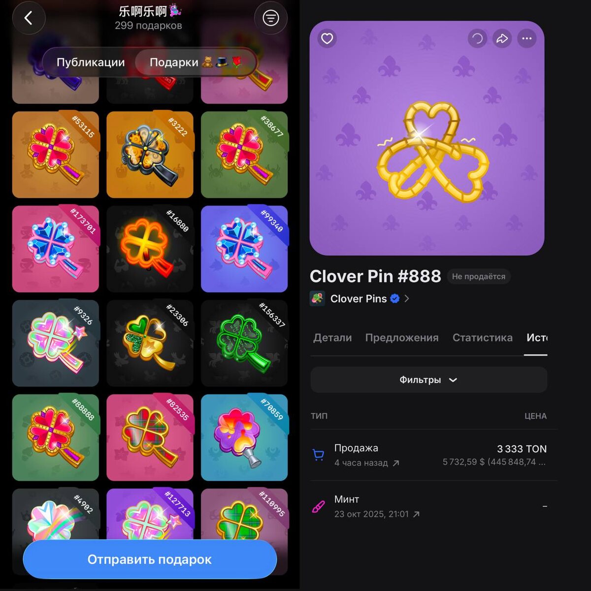 ? На рынке появился китайский любитель клеверов, он приобрел 47 клеверов на $16 200 Значимую часть лотов заняли необычные номера по типу #888, #88888 и черные фоны: Clover Pin #888 — 3333 TON (5 700$) Clover Pin #4902 — 1500 TON (2570$) Clover Pin #99340 — 1000 TON (1700$) Clover Pin #156337 — 1000 TON (1700$) Clover Pin #9326 — 1000 TON (1700$) Clover Pin #88888 — 500 TON (850$) Clover Pin #23306 — 350 TON (600$) Clover Pin #82535 — 300 TON (512$) Clover Pin #110995 — 210 TON (360$) Clover Pin #67707 — 177 TON (300$) Clover Pin #53115 — 150 TON (250$) ➖➖➖➖➖➖➖➖➖➖➖ 🙂 Portals 🙂 Tonnel 🙂 Купить Звёзды 🙂 Обмен STARS на TON ⭐️ Купить звёзды