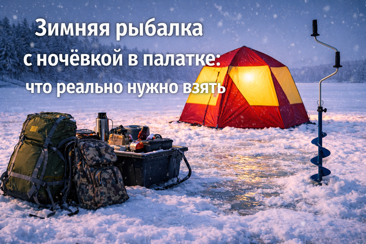 Зимняя рыбалка с ночёвкой — это уже не просто выезд на лёд, а настоящее туристическое приключение. Мороз, тишина, палатка посреди водоёма и ожидание ночного клёва. Чтобы поездка не превратилась в испытание, важно взять только нужное — без лишнего хлама. В этой статье делюсь своим практическим набором рыболова‑туриста. Ночная рыбалка зимой имеет свои плюсы: Но без подготовки ночёвка может быстро испортить впечатления. Без этого ночёвка невозможна. Минимум: Тепло: ⚠️ Обязательно оставляйте вентиляцию — безопасность важнее тепла. Даже если клёв слабый, спать всё равно придётся. Проверенный набор: 💡 Совет: лучше два слоя тепла, чем один «очень тёплый». Главная ошибка новичков — брать слишком много одежды. Достаточно: Важно, чтобы одежда была сухой. Всё остальное — лишний вес. Ночью не нужен целый магазин снастей. Берём: Чем проще — тем спокойнее ночь. Ночью горячая еда решает многое. Минимум: Свежий улов — лучший ужин на льду. Из личного опыта: Лёд любит простоту. Ночная зимняя рыбалка —