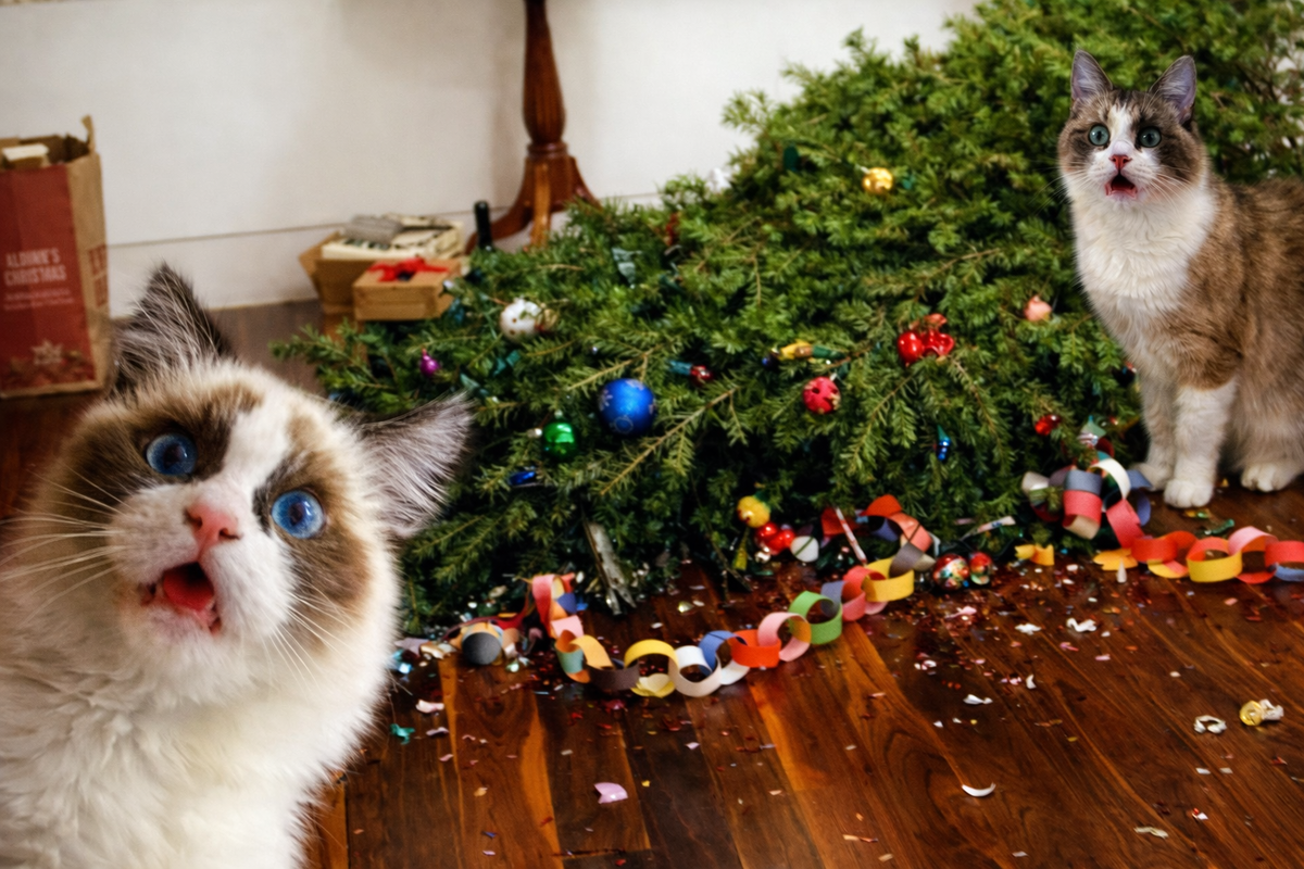 Забавные новогодние фотографии котиков, которые наводят праздничную суету. Парочка советов о том, как это можно было избежать.