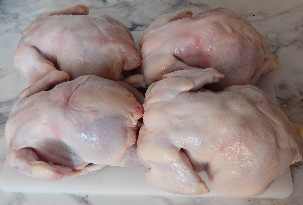 Удачно зашла в приложение Вкусвилл и попала на зеленые ценники на тушки цыпленка. Взяла 4 шт на 7 кг. Вымыла и разделала кур, получила 8 филе грудки, сегменты крыльев, 8 окорочков и еще 4 остова на бульон Крылья сразу отправляю в пакет с пакетами с крыльями, теперь как раз там накопился 1 кг, и их можно запекать. 8 окорочков буду мариновать в двух разных маринадах из грудок тоже получится несколько блюд Давайте готовить 😊 Остовы сразу отправляю вариться. Все вместе в одной кастрюле. Получу в итоге концентрированный бульон и много вареного куриного мяса. С ним люблю делать горячие бутерброды к обеду, можно завернуть как начинку в блинчики или в лаваш, сделать салат или паштет. Окорочка мариную по 4 шт в двух маринадах. Первый -с пастой том ям. Второй - соевый соус, горчица, домашний кетчуп. Филе грудки 1. у всех частей удалила малое филе. Нарезала его кубиками, пойдет на плов или гречку с курицей и овощами. 2. половину - 4 филе - запекаю в фольге. Два филе натираю пастой том ям (б