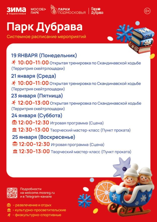 ✨ Расписание в парке Дубрава на неделю с 19 января 🚩Выбирайте активности и присоединяйтесь к нам 📆 19.01.2026 🏢 Парк культуры и отдыха «Дубрава» 📍 г.о.Подольск, микрорайон Климовск, ул. Победы, д.3 💰 Вход свободный❗️ ⭐Поддержать канал голосом 🍰Где поесть в Подольске ✅ Мероприятия Подольск https://dzen.ru/id/66ed500f7b5671493eca3fd6 http://vk.com/podolsk_events http://dzen.ru/podolsk_events