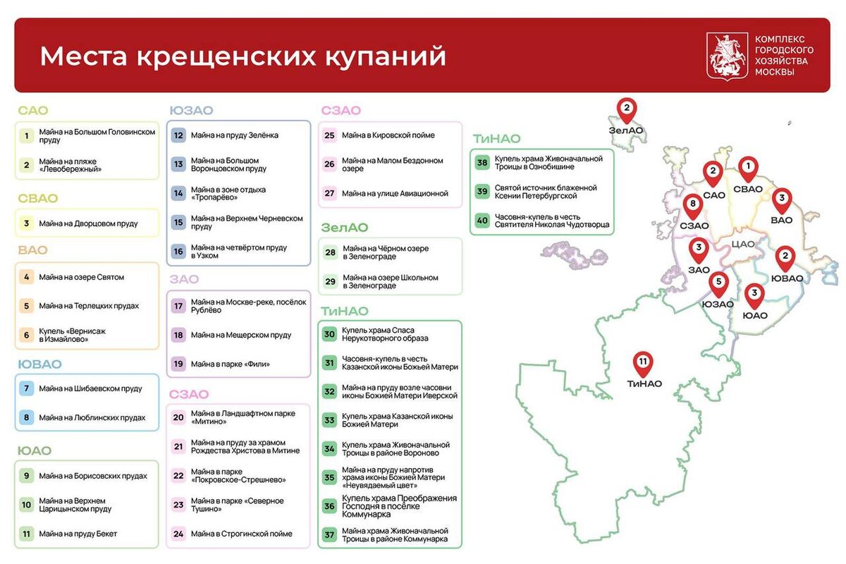 Купели откроются 18 января в 18:00 и будут работать до 18:00 19 января. Об этом сообщил Сергей Собянин. В период крещенских купаний важно не забывать о безопасности. • Заходите в воду только в официально оборудованных купелях • Не ныряйте и не окунайтесь с головой • Не купайтесь в одиночку • Алкоголь под строгим запретом Сразу после выхода из воды переоденьтесь в сухую и тёплую одежду и выбирайте места, где дежурят спасатели и скорая помощь.