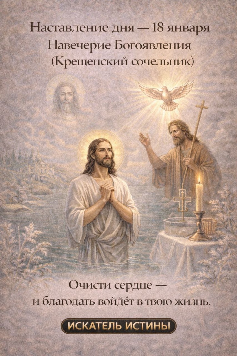 Навечерие Богоявления (Крещенский сочельник) Навечерие Богоявления — особый день тишины, сосредоточенности и духовного ожидания. Церковь подводит нас к великому событию Крещения Господня, когда Сам Христос входит в воды Иордана, освящая всю тварь и открывая миру тайну Пресвятой Троицы. Этот день призывает не к суете, а к внутреннему очищению. Пост, молитва и воздержание в Крещенский сочельник — не формальность, а путь к обновлению сердца. Подобно воде, которая завтра будет освящена, и наша душа призвана очиститься от грехов, обид и рассеянности. Господь приходит к человеку тихо — не с громом и силой, а со смирением. И сегодня Он ждёт от нас не внешних жестов, а искреннего покаяния, жажды правды и готовности изменить свою жизнь. Пусть этот день станет для тебя порогом духовного обновления, чтобы встретить Богоявление с чистым сердцем, благодарностью и живой верой.