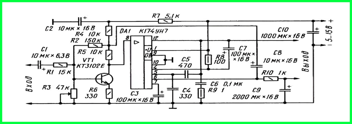 Теперь хочу поделиться этой схемой на К174УН7 с вами - возможно, она пригодится. Может быть, у кого‑то эти микросхемы ещё лежат в закромах?
