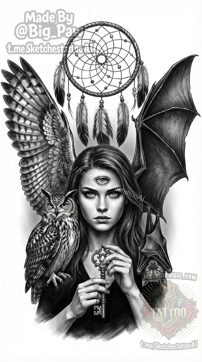 рогов была) с летучей мышью и совой на плечах, чтобы у них по крылу было раскрыто и как будто у девушки они, если получится чтобы у каждого крыло было кверху, хотелось бы добавить третий глаз к тату и ловца, ну там как получится уже(если получится 😉) Пуст у девушке в руках будет ключ. Заранее благодарю 🙏 (просто очень хочется эзотерическое тату и какой-нибудь может можно будет это всё совместить, но я понимаю что это не просто). 🧠 SYNTX - тут создан эскиз 💎 Информация - все услуги 💀 Эскизы от нейросети 😎 Удалить тату #эзотерика #девушка #ведьма #эскиз #тату #татуировка