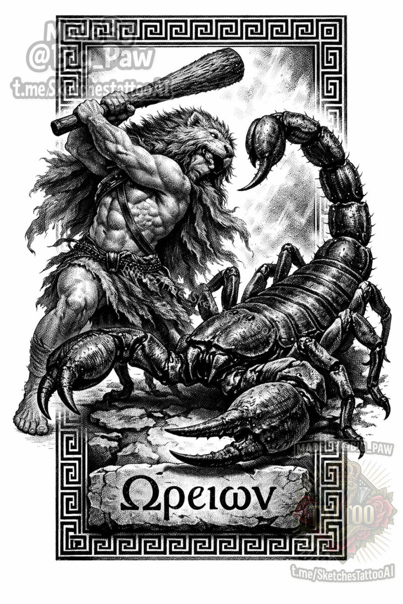 скорпионом и подписью Ώρειων по контуру узор древнегреческий 🧠 SYNTX - тут создан эскиз 💎 Информация - все услуги 💀 Эскизы от нейросети 😎 Удалить тату #греця #орион #скорпион #эскиз #тату #татуировка