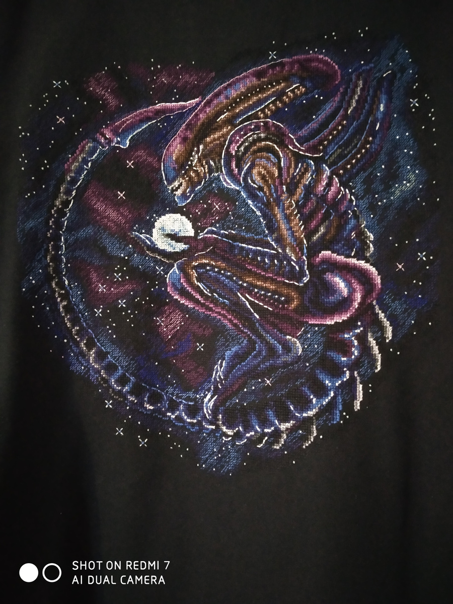 В начале 2025 года я закончила вышивать рубашку для сестры с Чужим на спине.