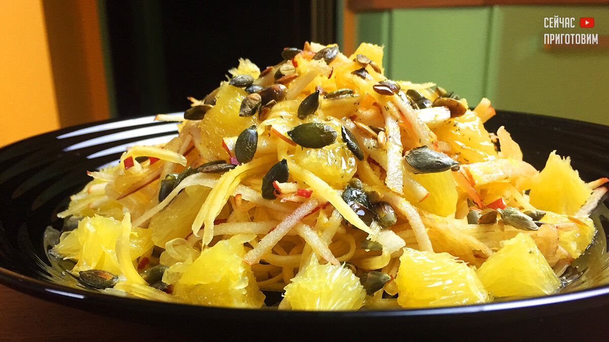 Это просто витаминная бомба: салат из сельдерея, тыквы и апельсина. То, что нужно для здоровья и фигуры! В зимний период такие салаты из сырых овощей — главные помощники для нашего иммунитета. Они низкокалорийные, яркие и невероятно полезные. Давайте готовить! Первым делом готовим заправку. В миску наливаем растительное масло и добавляем мед. Апельсин моем, разрезаем пополам и из одной половинки выжимаем сок прямо в миску. Всыпаем прованские травы, тщательно перемешиваем и даем заправке немного настояться. Тыквенные семечки слегка обжариваем на сухой сковороде. Масло добавлять не нужно — нам важно просто раскрыть их аромат и сделать их хрустящими. Корень сельдерея и тыкву чистим, моем и обязательно обсушиваем. Интересный факт: Считается, что корень сельдерея — это настоящий эликсир молодости, который способствует обновлению организма. Чтобы салат выглядел эстетично, натираем сельдерей и тыкву на терке для корейской моркови. Яблоко нарезаем тонкой соломкой. Соединяем овощи и яблоко в с