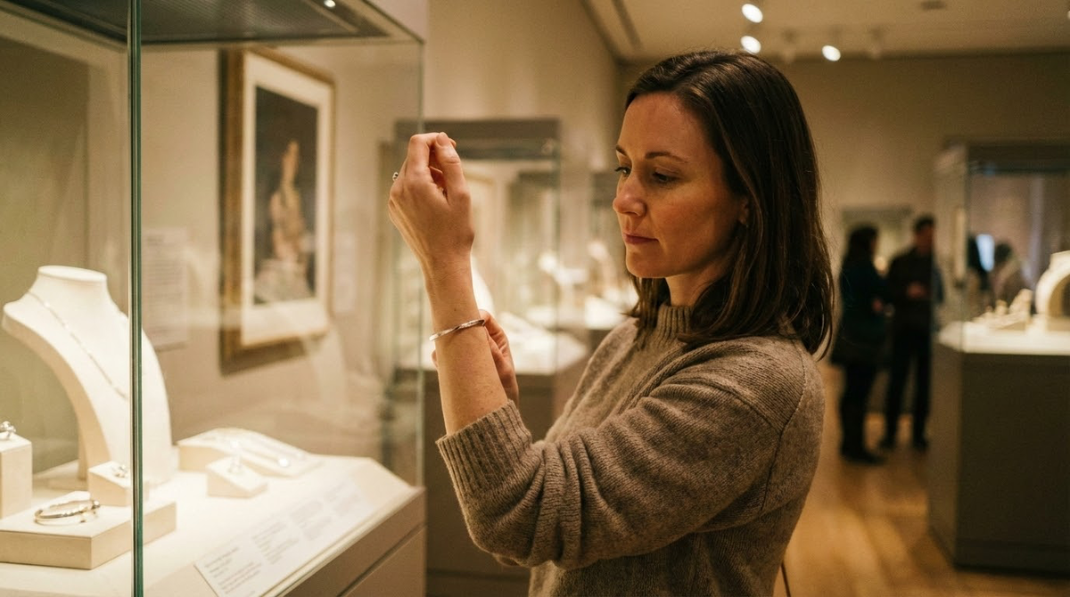 Я медленно шла вдоль стендов, разглядывая экспонаты. Броши в виде колосьев и звёзд. Серьги с красными камнями. Кольца – массивные, с чернением. Каждая вещь – чья-то история. Чья-то жизнь, упакованная в металл и стекло витрины.