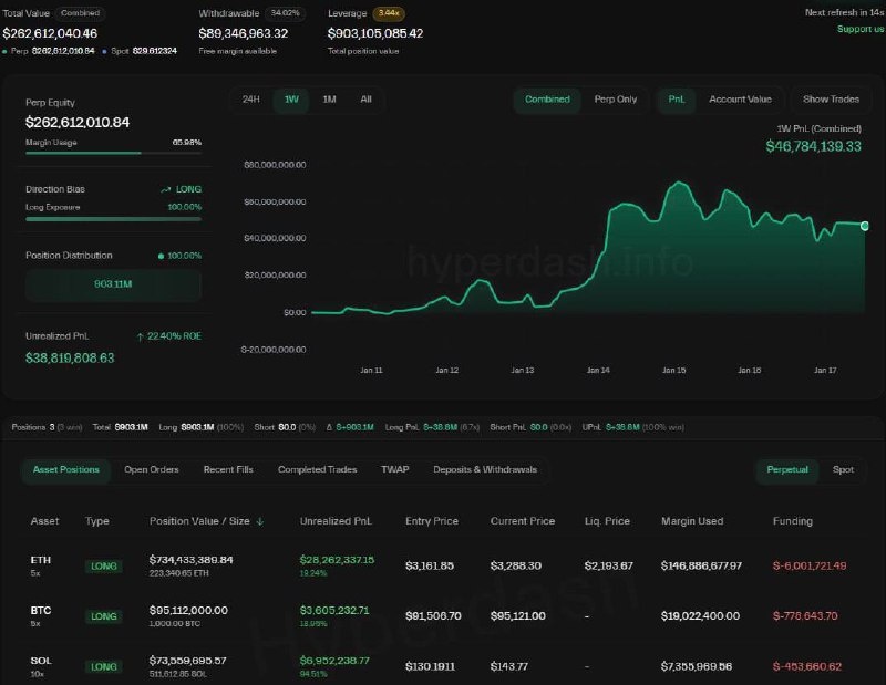 Длинная позиция инсайдерского биткоин-кита теперь превышает $900 миллионов.