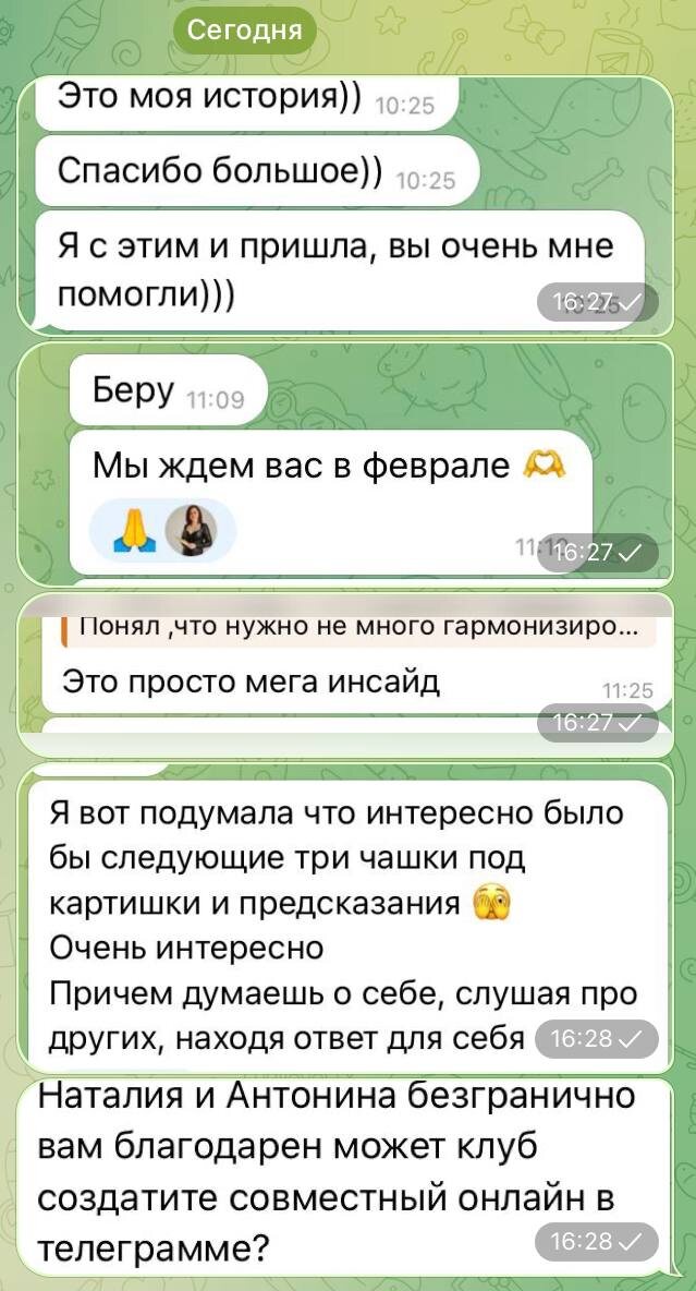 ». Делюсь маленькой частью отзывов. Самое классное, что участники опять ждут продолжения!😀☕️ Вот это вкусный чай у нас получается! Приглашаем тебя присоединиться к нам на «3 чашки чая» в феврале. Чтобы научится ставить свои цели и в 2026 году встречать судьбоносные перемены. Ставь + и расскажу подробнее.