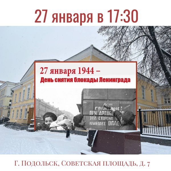 ✨ Мероприятие ко Дню снятия блокады Ленинграда ‼️Для посетителей будет проведена экскурсия "Подольчане - защитники блокадного Ленинграда". 🚫 Возраст: 0+ 📆 27.01.2026 🕒 17:30 🏢 Подольский краеведческий музей 📍 г. Подольск, Советская площадь, д.7 💰 Вход свободный❗️ ⭐Поддержать канал голосом 🍰Где поесть в Подольске ✅ Мероприятия Подольск https://dzen.ru/id/66ed500f7b5671493eca3fd6 http://vk.com/podolsk_events http://dzen.ru/podolsk_events