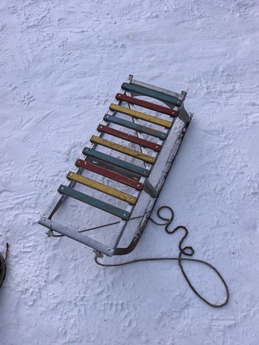 Пока папины ретро- тачки стоят в теплом гараже, папа взял у бабушки свои ретро- санки