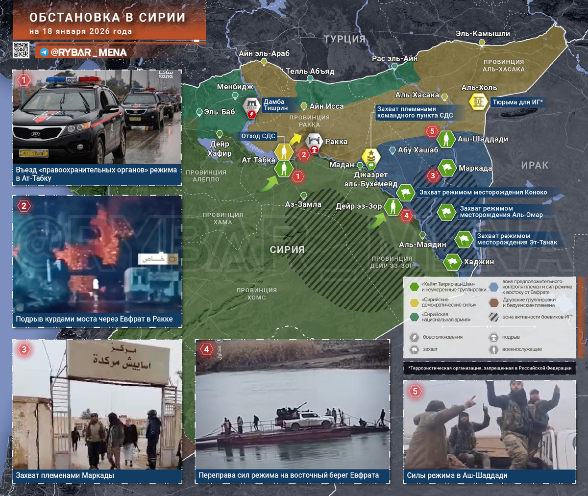 Судя по всему, к западу от Евфрата боеспособных курдских подразделений не осталось — все формирования «Сирийских демократических сил» (СДС) к утру 18 января перешли на восточный берег реки, а оставленные ими территории заняли силы режима Абу Мухаммада аль-Джуляни. 🔸Хотя этим проблемы курдов не ограничиваются, особенно в провинции Дейр эз-Зор. На фоне успеха «зеленых» приободрились местные арабские племена, и все больше кадров указывает на захват обширных территорий на восточном берегу Евфрата с достижением провинции Аль-Хасака. 🔻Подробнее о событиях: 🔸Формирования сирийского режима заняли Ат-Табку, добавив к числу трофеев еще один аэродром, а также окрестные месторождения нефти и газа. «Сотни курдов» якобы попали в плен. 🔸Руководство режима обвинило курдов в казни заключенных их тюрьмы Ат-Табка перед отступлением СДС в Ракку. 🔸Чтобы не допустить дальнейшее продвижение сил Аль-Джуляни к Ракке, СДС взорвали мосты через Евфрат. Тем самым курды уничтожили и водопровод, усугубив гумани