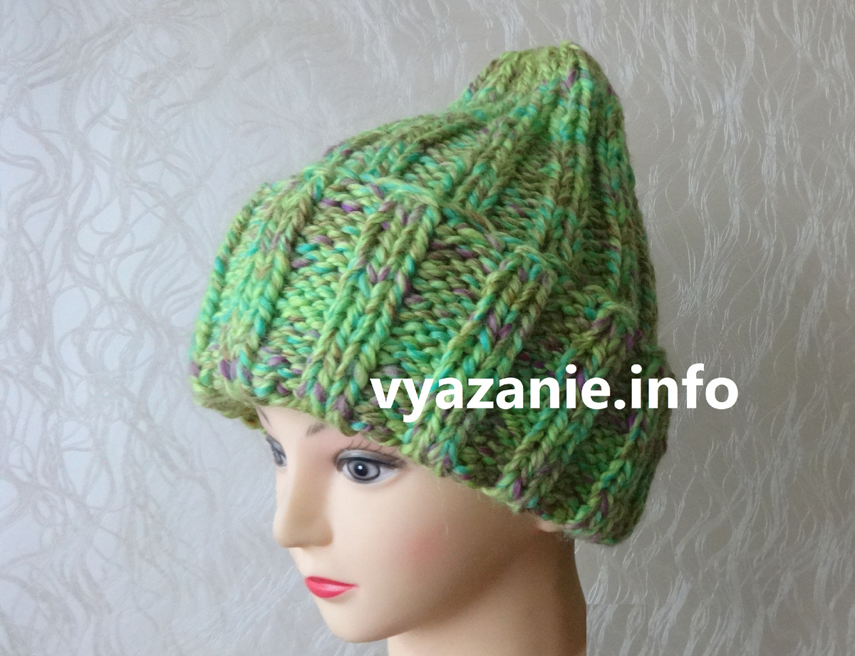Шапка, связанная резинкой, в моде уже много лет. Она очень тёплая. Свою шапку я связала за вечер. Ношу с горнолыжным костюмом. Даже при температуре -43 градуса Цельсия в ней тепло. Отворот держится сам без каких-либо ухищрений. Снизу вверх. Сначала вяжем отворот резинкой *3 на 2*. Потом переходим на резинку *2 на 2*. Убавляем петли на макушке. Пряжа у меня ДИЗАЙНЕРСКАЯ, Креативная серия, фабрика ПЕХОРКА. В 200 г 150 м, 50% шерсть полутонкая, 50% ПАН высокообъёмный. Рекомендуемый размер спиц 9-11, крючка 10-12. Мне нужна тёплая шапка, поэтому спицы я взяла тоньше. На круговые спицы №7 набираем число петель, кратное 4. Я вязала так. Крестообразным способом набираю 56 петель +1 для смыкания в круг. Соединяю петли в круг, вешаю маркер начала ряда. В первом ряду вяжу *2 лицевые, 1 изнаночная, накид, 1 изнаночная*. Повторяем до конца ряда от * до *. Дальше буду вязать резинкой *2 лицевые, 3 изнаночные* 14 рядов или 9 см. Вы вяжите нужную длину отворота. В следующем ряду убавляю петли: *2