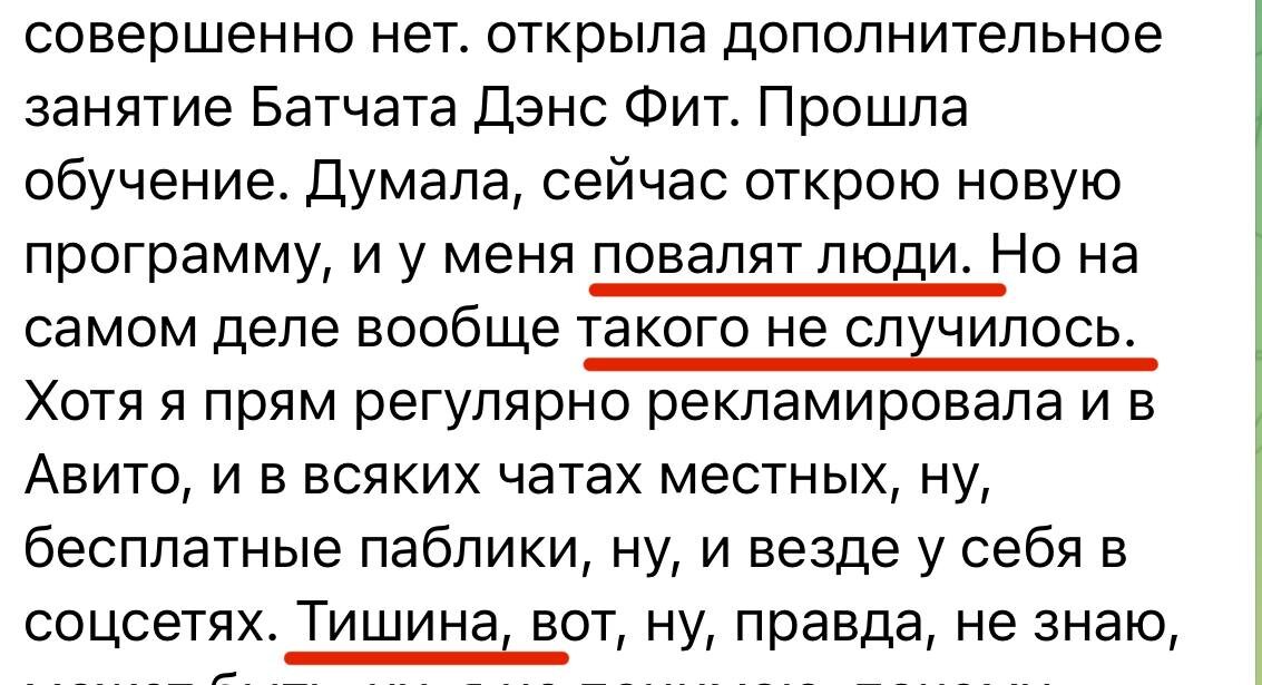Я слышу очень часто: «Сейчас я пройду программу бачата/стронг/функционал и еще 100500 разных программ» и сейчас мне не до блога А что дальше? Если у вас есть вариант идти в найм (и то за супер маленькие 💵) А если вы собираетесь открыть новую группу даже на аренде - может произойти так, что вы выйдете в сторис с продажей «открываю класс» - а в ответ тишина) Это очень большая иллюзия, что повышение квалификации = клиенты. Это практически не связанные вещи Второй важный момент, что уже перед тем, как куда-то идти обучаться вы можете (и должны) вести блог, показывать «путь героя» - почему выбрали эту тему, почему вам она интересна, что она вам дает и что будет давать клиентам. И тогда они уже начнут сами прогреваться к вашему классу и в тот самый торжественный момент «приходите на новый класс» - у вас уже собрана база ожидающих и предвкушающих Развивать личный бренд нужно всегда) Например, перед тем как открыть зумба-клуб я почти год телилась прогревала людей )) Говорила как я гот