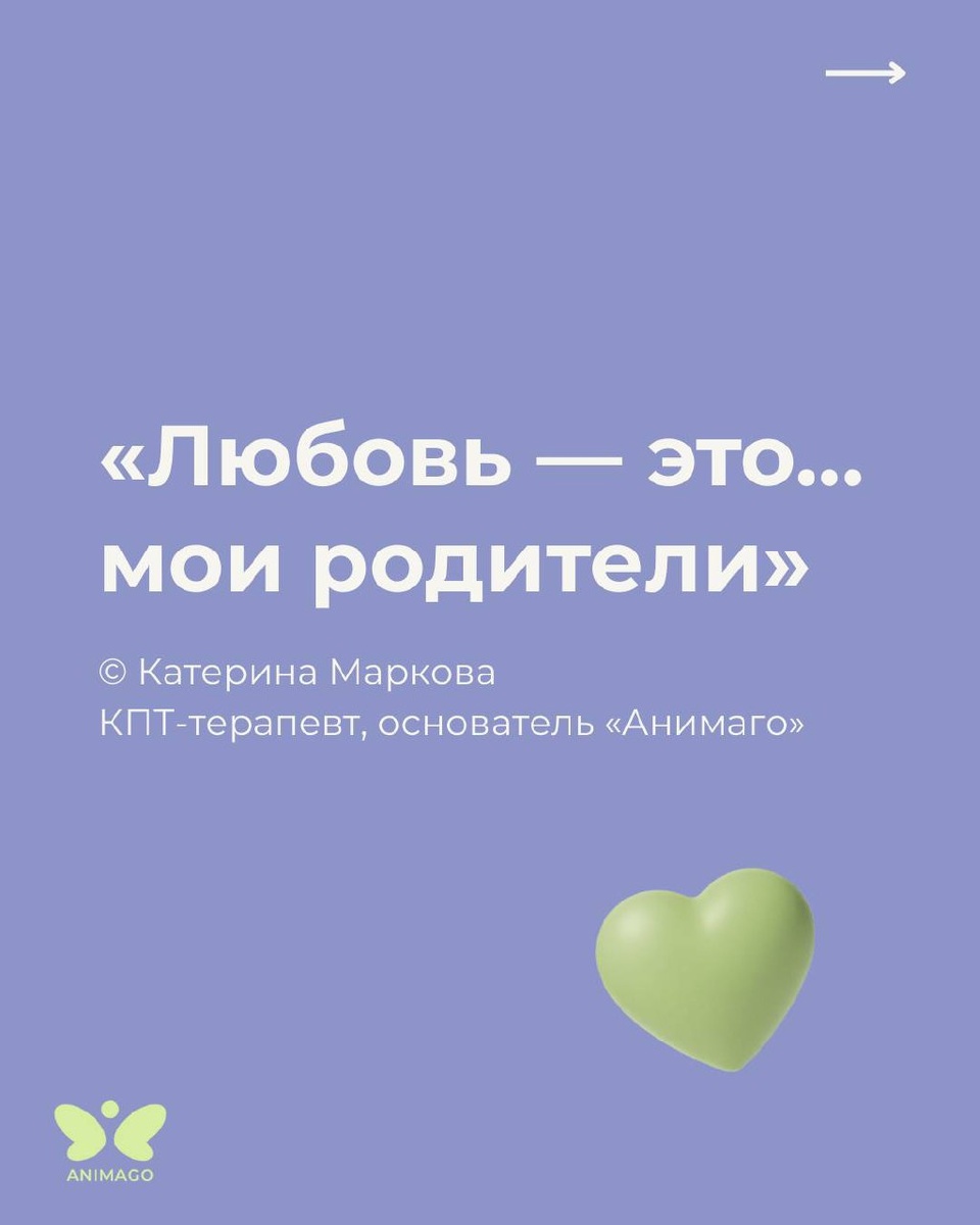 будущем. На этом искажённом понимании любви ребёнок будет строить нездоровые отношения с самим собой. То, как ребёнок понимает любовь, он сначала узнаёт в отношениях с родителями. Через реакции, слова, запреты и поддержку формируется его внутреннее ощущение: «со мной можно так». КПТ-терапевты в «Анимаго» могут помочь разобраться со всеми сложностями, которые возникают у вашего ребёнка или у вас. 🦋 Подробнее о Чекапе — по ссылке.