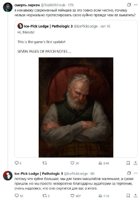 Геймерам не угодишь: Разработчики Ice-Pick Lodge ответили челу на вопрос, почему столько фиксов