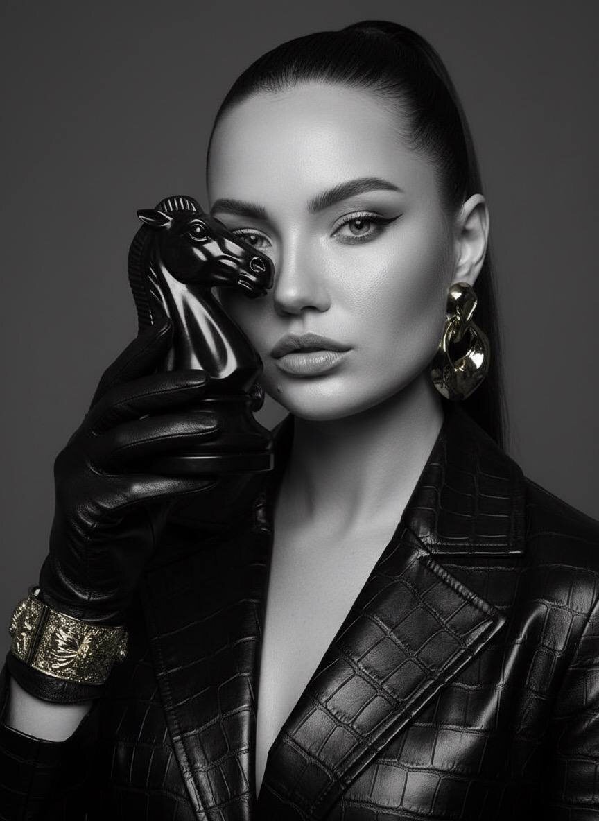 Нейросети научились создавать портреты уровня Vogue и Harper's Bazaar — с такой детализацией текстур и светом, что фотографы иногда просят рецепт. Но секрет не в магии ИИ, а в умении правильно описать желаемое. Покажу на примере промпта, который даёт гиперреалистичный портрет элегантной женщины в стиле высокой моды. Вот он целиком — копируй и тестируй: Создай портрет, не меняя черты лица Крупный план, художественный портрет элегантной женщины в стиле «высокая мода». Она позирует, частично закрывая лицо большой глянцевой черной шахматной фигурой коня. На ней черная кожаная куртка с текстурой крокодила и черные кожаные перчатки. На руке массивный золотой браслет. Кожа лица сияющая, с влажным финишем, безупречный макияж в нюдовых и коричневых тонах, выразительные глаза. Волосы убраны в гладкий хвост. В ушах массивные золотые серьги необычной формы.