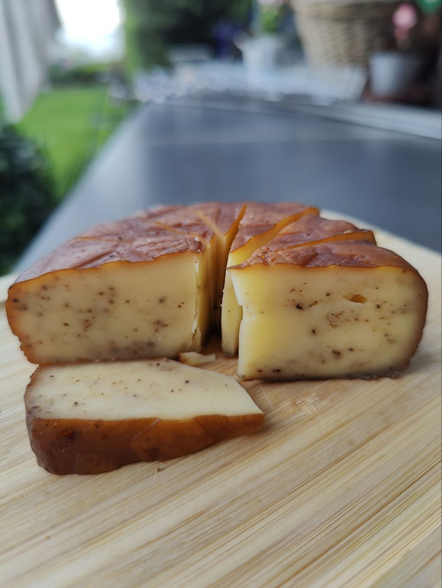 Сыр имеет плотную ароматную темную корочку. Молотые кофейные зерна, добавленные в тело сыра оттеняют его вкус и сливаются в один неповторимый мягкий, нежный сырно-кофейный аромат.