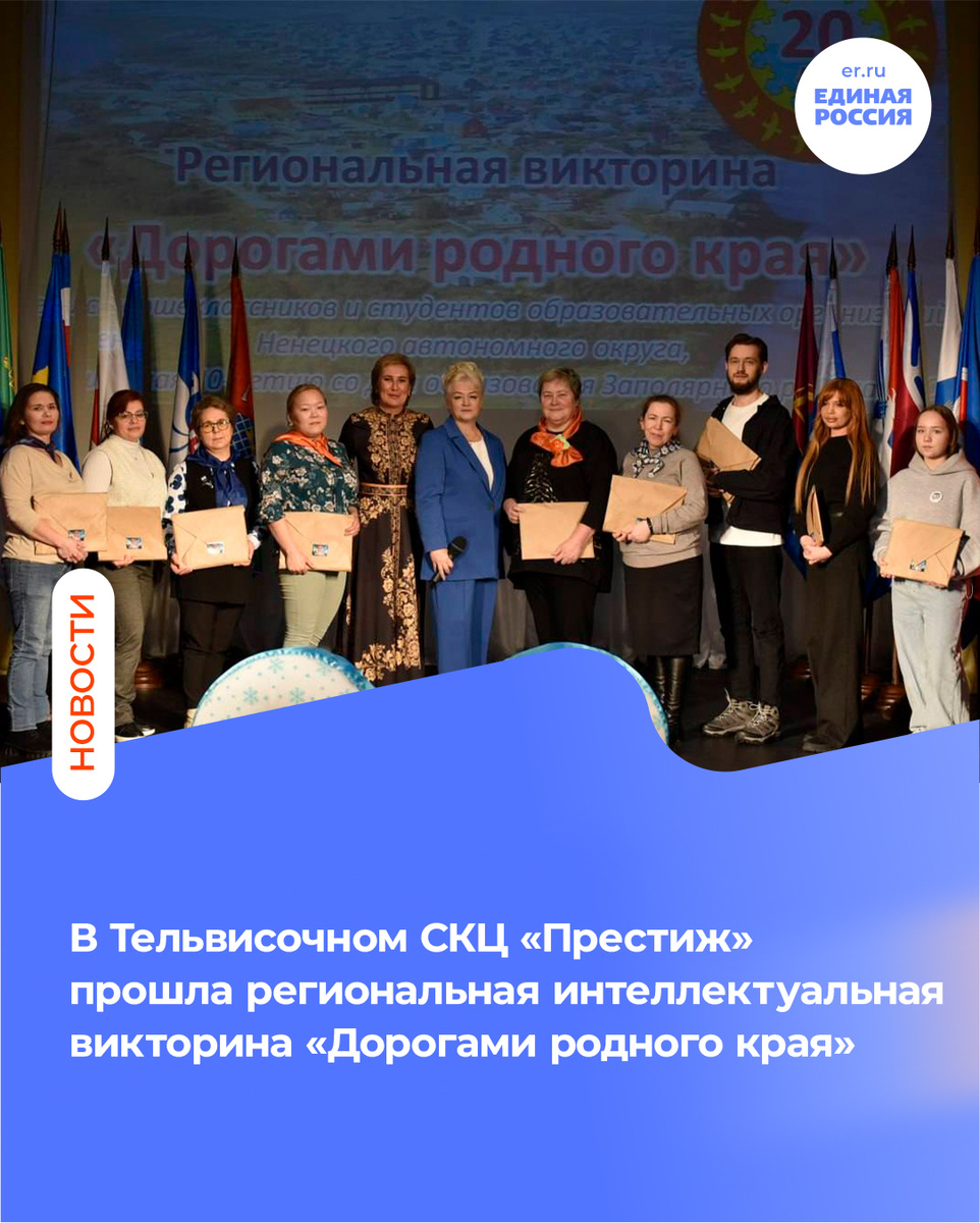 В Тельвисочном социально-культурном центре «Престиж» прошла региональная интеллектуальная викторина «Дорогами родного края», приуроченная к 20-летию Заполярного района и старту Года единства народов России. Мероприятие организовано при поддержке регионального отделения Партии «Единая Россия» и объединило 12 команд старшеклассников и студентов из всех уголков Ненецкого округа.