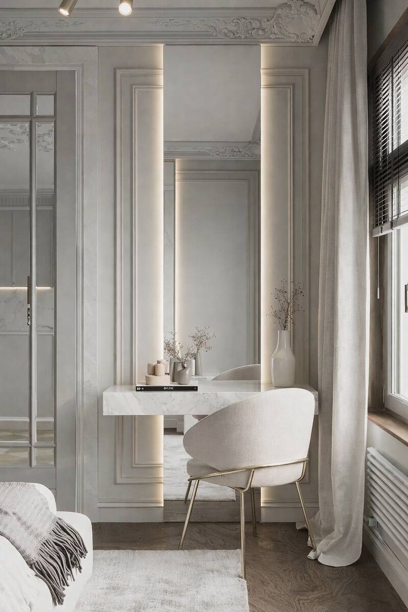 Обратите внимание, как здорово смотрятся зеркала в сочетании с лепниной ✔️ Молдинги и угловые элементы, окрашенные в тон стен, создают гармонию пространства. Получится отличная бьюти-зона 👍
