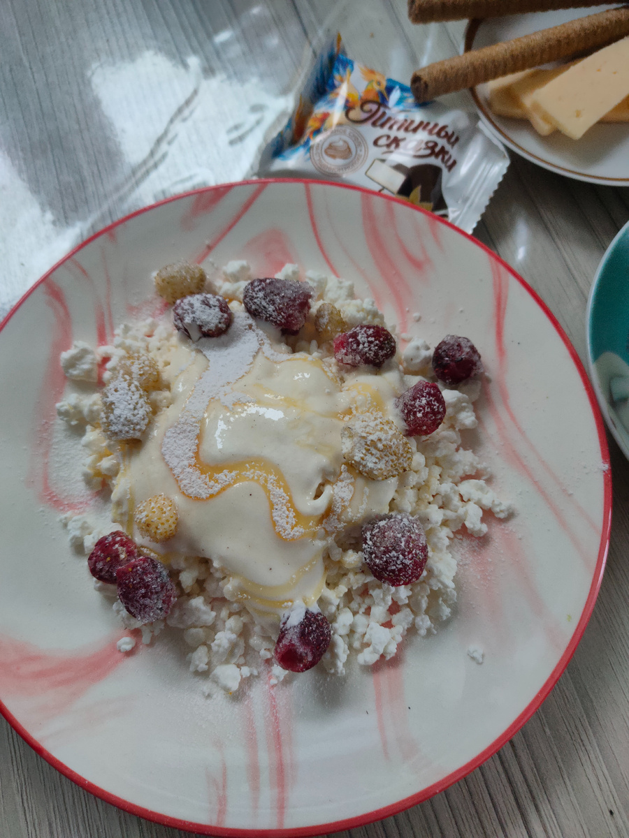 Пусть сегодня с самого утра все будет лучше, чем вчера. Доброе, доброе утро! С вами Надежда, и я приглашаю вас на мою кухню, где покажу вам мое меню на день. Погода изменилась. Температура повысилась до - 12 - 13 градусов, но почти целый день шел небольшой снег. Убирать не стала, завтра после завтрака займусь. На завтрак был сегодня творог со сметаной. медом, замороженными ягодами земляники, все присыпала сахарной пудрой, к кофе были ломтики сыра, вафельные трубочки и конфета Птичьи сказки. Почему - то сегодня я считала, что уже понедельник, поэтому с утра пыталась позвонить в СФР, чтобы записаться на прием. Звонила по двум номерам, про себя возмущалась, где они, почему не берут трубку. Звонила и до обеда и после обеда, потом уже до меня дошло, что сегодня воскресенье. Видно, я себя настроила, что в понедельник обязательно буду звонить. На обед сварила борщ, заправка у меня уже была, времени на готовку ушло немного. Итак, обед: борщ, который я ела со сметаной, доела холодец с горчи