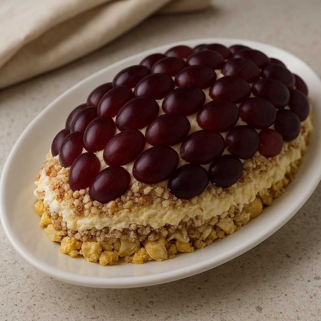 Этот салат отличается не только насыщенным вкусом и высокой питательностью, но и привлекательным внешним видом в виде виноградной грозди. Он отлично впишется в праздничное меню и обязательно поразит гостей.