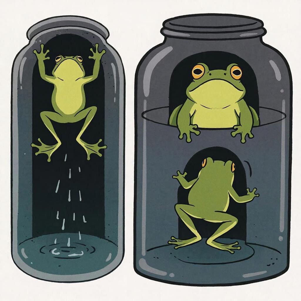 Знаете притчу о двух лягушках в банке со сметаны? В двух словах: обе тонут. Одна сдаётся и гибнет. Другая отчаянно барахтается — и взбивает сметану в масло. Слепок становится её спасением. Казалось бы, просто история про упорство. Но на самом деле это точная метафора работы нашей психики в стрессе. Что здесь происходит на уровне психологии и физиологии?