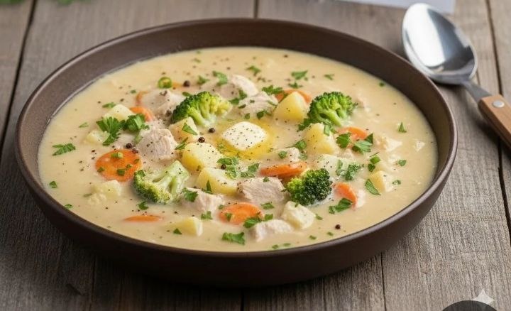 🥣 ⏱30 минут | 85 ккал(100 г) 🛒Что нужно: 🍗Куриное филе — 300 г 🥔Картофель — 3 шт. 🥕Морковь — 1 шт. 🧅Лук репчатый — 1 шт. 🥦Брокколи или цветная капуста — 200 г 🥛Сливки (10%) — 150 мл 🧈Сливочное масло — 10 г 🌿Свежая петрушка 👩🍳Как готовить: Куриное филе нарежьте небольшими кусочками и отварите в подсоленной воде до готовности (около 15-20 минут). Лук и морковь мелко нарежьте и слегка припустите на сливочном масле прямо в кастрюле. Добавьте к овощам нарезанный кубиками картофель и залейте бульоном от курицы. Варите 10 минут, затем добавьте соцветия брокколи и варите еще 5-7 минут. В конце влейте теплые сливки, добавьте готовое мясо и прогрейте (не доводя до кипения). Посыпьте рубленой петрушкой перед подачей.