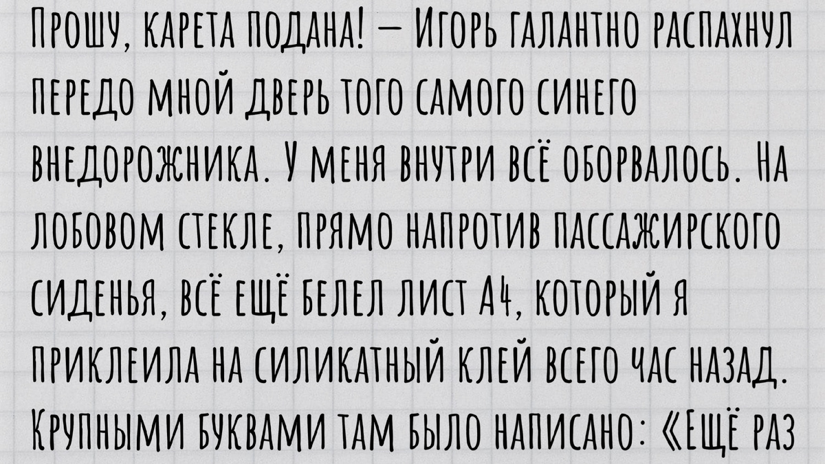 — Прошу, карета подана! — Игорь галантно распахнул передо мной дверь того самого синего внедорожника. У меня внутри всё оборвалось. На лобовом стекле, прямо напротив пассажирского сиденья (в темноте я перепутала стороны!), всё ещё белел лист А4, который я приклеила на силикатный клей всего час назад. Крупными буквами там было написано: «Ещё раз так встанешь — спущу колеса!».