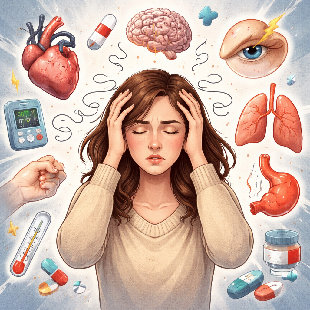 Сегодня внимание приковано к сердцу, завтра — к дыханию, затем — к зрению, онемениям, координации, «мозгу» или «нервам». Симптомы могут исчезать и возвращаться, мигрировать по телу, усиливаться в покое и ослабевать при отвлечении внимания. Общим остаётся одно — постоянное ощущение угрозы.