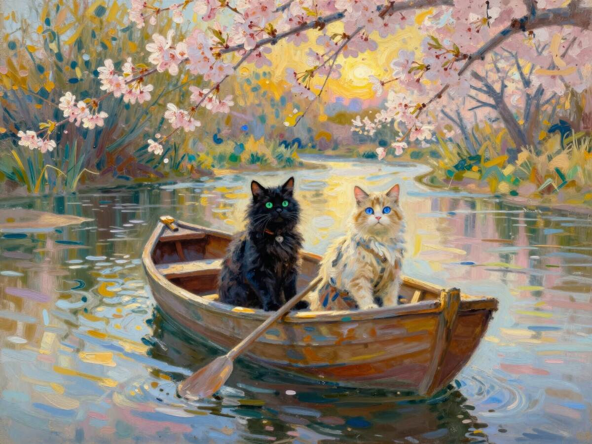 Однажды майским утром, когда река отливала серебром в лучах восходящего солнца, коты решили отправиться в путешествие — проплыть по реке, узнать, что таится за поворотом. С собой они взяли лишь верёвочку да маленький мешочек для находок. Воздух был напоён ароматом цветущих лугов, а река, словно живая, манила вдаль своим таинственным шёпотом.