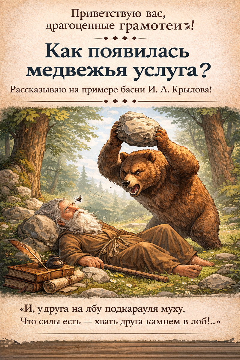 Знаете, откуда пошло это выражение? Мы то и дело бросаем: «Да это же медвежья услуга!» — когда помощь оборачивается проблемой. Но задумываемся ли, какой древний и поучительный сюжет за ним стоит? А ведь вникать в происхождение слов — это волшебный ключик. Он делает нашу речь не просто грамотнее, а богаче, увереннее и убедительнее. Мы начинаем чувствовать язык, как живую ткань, сотканную из истории и смыслов. Сегодня — разбираем один из таких ярких фразеологизмов. Всё началось с гения Ивана Крылова. В его басне «Пустынник и Медведь» завязывается трогательная дружба между отшельником и лесным жителем. И вот кульминация: медведь, желая защитить спящего друга от назойливой мухи, берётся за дело со всей своей богатырской прямотой. Не смог согнать её лапой — что ж, есть надёжнее способ! «И, у друга на лбу подкарауля муху,