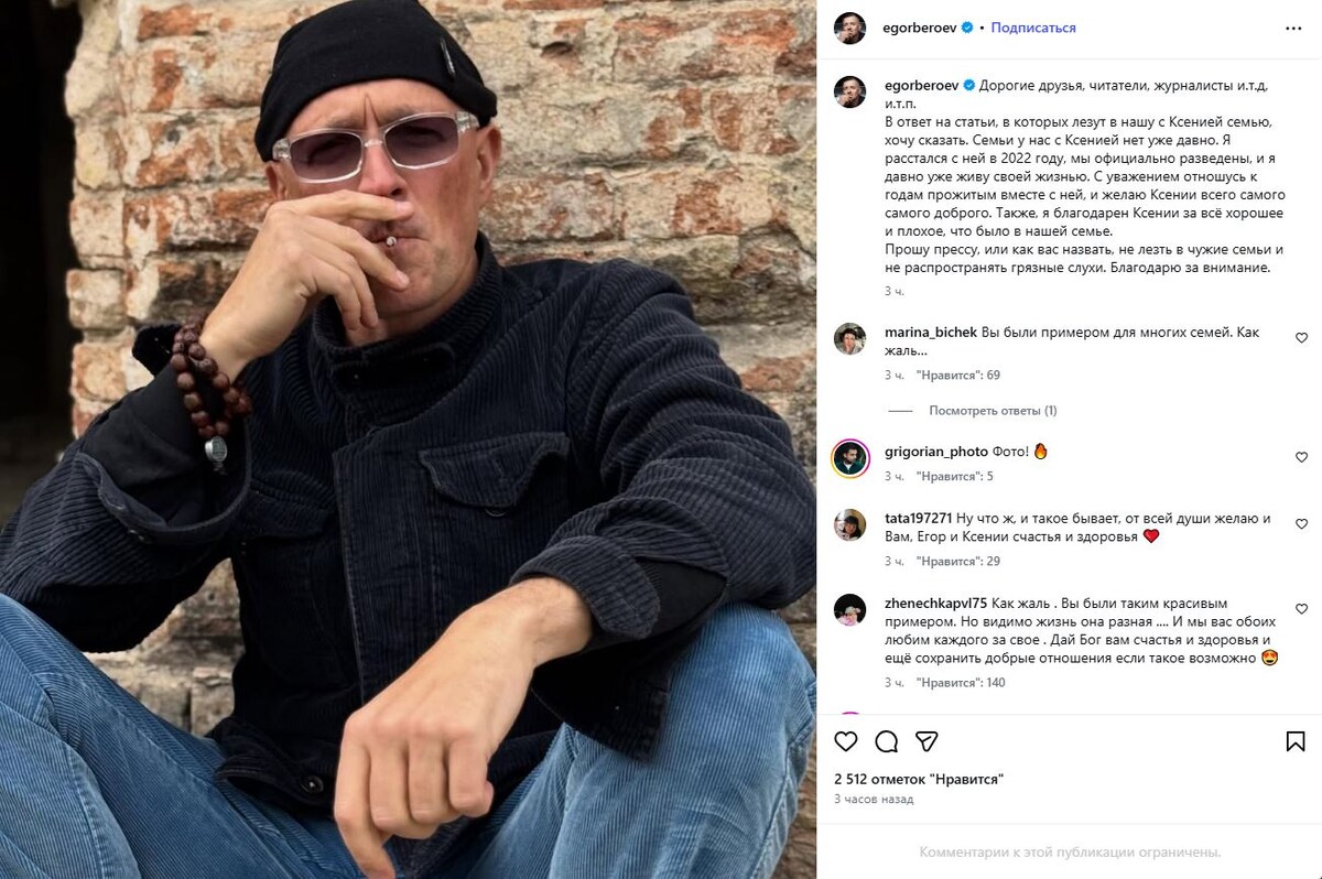 Бероев, этот «рыцарь» с весьма специфическим взглядом, решил-таки прокомментировать перемены. И как прокомментировал! Слышите этот тон? «Семьи у нас с Ксенией нет уже давно. Я расстался с ней в 2022 году, мы официально разведены, и я давно уже живу своей жизнью». Обратите внимание на формулировку: не «мы разошлись», а «я расстался с ней». Словно Ксения — это прочитанная книга, которую он соизволил закрыть. Сквозит такая холодность и пренебрежение, будто она ему жизнь испортила, а не он ей спокойствие годами нарушал своими бесконечными поисками вдохновения на стороне.
