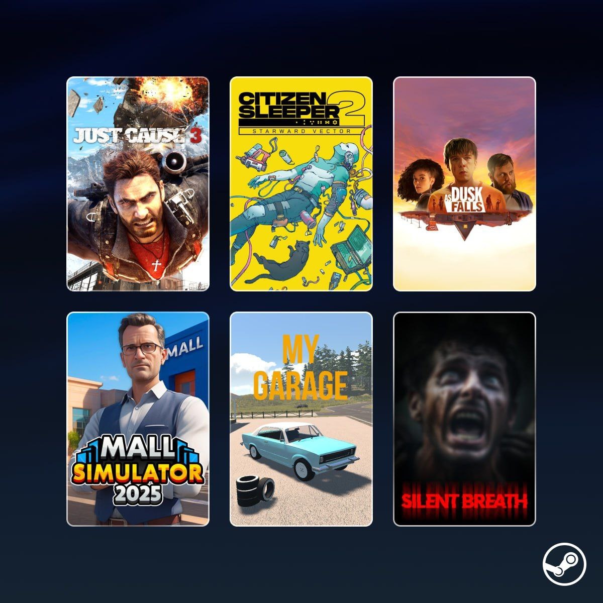 Скидку в 85% получила Just Cause 3 (недоступна в России), скидка 40% на Citizen Sleeper 2: Starward Vector, скидка 75% на As Dusk Falls (недоступна в России), скидка 30% на Mall Simulator, скидка 20% на My Garage и скидка 55% на SILENT BREATH Just Cause 3 (недоступна в России) — 34 ₴, 349 ₸, 1.41 $ 85% из 101832 обзоров положительные. Citizen Sleeper 2: Starward Vector — 528 ₽, 309 ₴, 3840 ₸, 7.49 $ 92% из 1892 обзоров положительные. As Dusk Falls (недоступна в России) — 94 ₴, 975 ₸, 3.62 $ 91% из 3363 обзоров положительные. Mall Simulator — 343 ₽, 217 ₴, 2660 ₸, 4.89 $ 92% из 2068 обзоров положительные. My Garage — 440 ₽, 412 ₴, 5120 ₸, 9.99 $ 92% из 3544 обзоров положительные. SILENT BREATH — 173 ₽, 101 ₴, 1305 ₸, 2.83 $ 69% из 986 обзоров положительные.