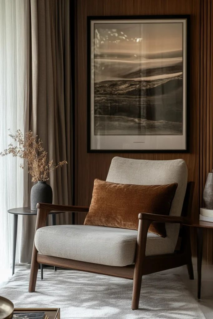 - Мягкая обивка — ткань (шерсть, бархат, букле, лён) или кожа. Тактильность важна — приятно на ощупь, тёплое.