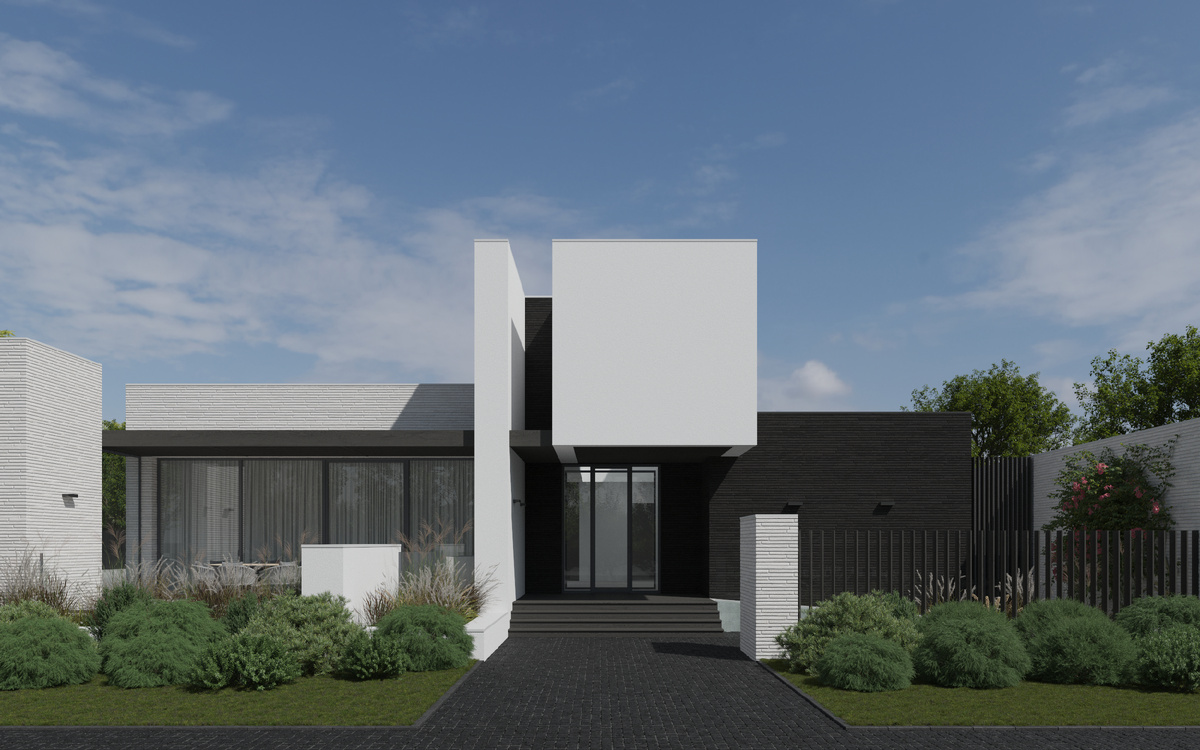 Заказчик этого проекта обратился к нам с очень непростой задачей. На узком и длинном участке нужно было не только спроектировать жилой дом с большим набором помещений, но и спа-зону, которая бы функционировала независимо от дома. Въезд на участок осуществляется с узкого торца, таким образом, нужно было выбрать, какая часть застройки будет выходить на улицу, а не на соседние участки. После анализа всех пожеланий возможных компоновок на участке, мы пришли к тому, что наиболее удачное решение — это закрыть жилой дом от улицы спа-зоной, обеспечив таким образом её независимое функционирование и одновременно приватность жилого дома. Благодаря большой глубине участка у дома при таком расположении осталось еще достаточно места для сада и террасы с бассейном. Окна детских выходят на соседний участок, но максимально удалены от его границы. Спальня родителей — это мастер-спальня со своей гардеробной и санузлом также ориентирована на сад и террасу с бассейном. Помимо жилых помещений на втором этаж