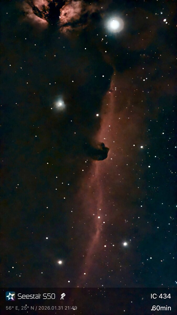 ». Перед вами туманность «Голова лошади». На этот снимок ушло больше часа времени и несколько кружек чая с ромашкой. Получилось великолепно. И я уверен, что смогу сделать лучше. Так как осознал, что туманность находится в созвездии Ориона, а именно его я наблюдаю каждую зиму с балкона своей спальни. Поэтому вернувшись в Питер сделаю повторную фотографию и сравню результат. Полагаю, что в Питере будет лучше, так как атмосфера зимой кристально чиста. Особенно в нашем лесу. И нет термических потоков воздуха, как на данном побережье. Но все эти бла бла бла ничто по сравнению с осознанием насколько огромна наша реальность и в какие дали мы имеем возможность заглянуть с нашей Планеты. Восторг. Благодарю Вселенную и Бога, что я живу именно в этом времени. Я счастлив ❤️.