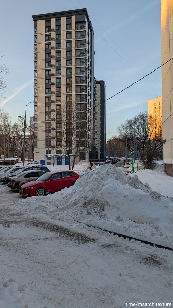 Достаточно неплохой дом по реновации. Из очевидных плюсов — неплохая этажность и четко выделенный двор без парковки. Фасад недорогой композитный на саморезах, но выглядит вполне прилично. Архитектура чем-то напоминает новые реконструированные поликлиники, нейтральная. Из интересного — поднятая в бетоне спорт площадка, на которой видимо ещё не успели установить забор. 📱 Архитекстура #Москва #реновация