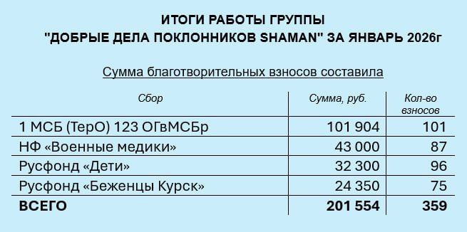Родные, подводим итоги работы нашей группы «Добрые дела поклонников SHAMAN» https://t.me/ddpshaman за январь 2026 года: 1️⃣. В январе мы приняли участие в 2-х сборах для бойцов из 1 МСБ (ТерО) 123 ОГвМСБр совместно с волонтёрской группой "Вместе с Донбассом" (https://t.me/+ttjOvv9naT1hYzFi). Было собрано 102 тыс. руб. ✅ Завершился сбор средств на очередной мавик https://t.me/ddpshaman/50051/57574 для бойцов. Мавик закуплен, отчет можно посмотреть в ветке «Отчеты гумконвоя»https://t.me/ddpshaman/42436/58683 ✅ Открыт сбор https://t.me/ddpshaman/50051/58785 на аккумуляторы, пропеллеры для мавиков и необходимые нашим ребятам бытовые мелочи и хозяйственные принадлежности Отправка 1-й и 2-й части сбора (Мавика и материалов дооснащения) планируется во второй половине февраля. 2️⃣. Продолжается 5-й этап сбора Народного Фронта «Военным медикам» https://t.me/ddpshaman/16614/47100, за время которого уже собрано 611 тыс. руб. 3️⃣. Завершен 32-й сбор средств https://t.me/ddpshaman/30851/58393 Русф