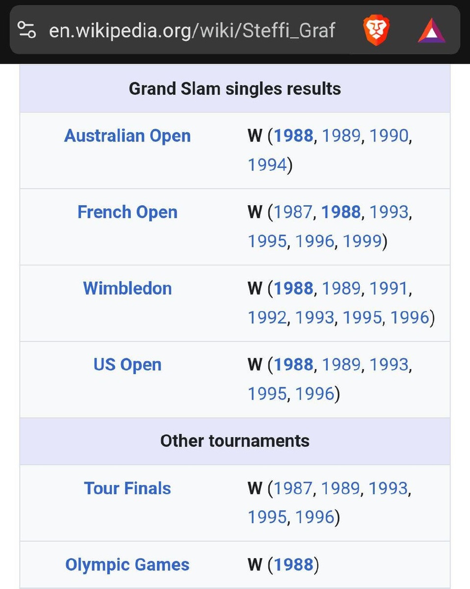 шлем в возрасте 19 лет 🎾🏆 В её активе: Australian Open (1988, 1989, 1990, 1994) French Open (1987, 1988, 1993, 1995, 1996, 1999) Wimbledon (1988, 1989, 1991, 1992, 1993, 1995, 1996) US Open (1988, 1989, 1993, 1995, 1996) Tour Finals (1987, 1989, 1993, 1995, 1996) Olympic Games (1988) Подпишись на Эйс и точка