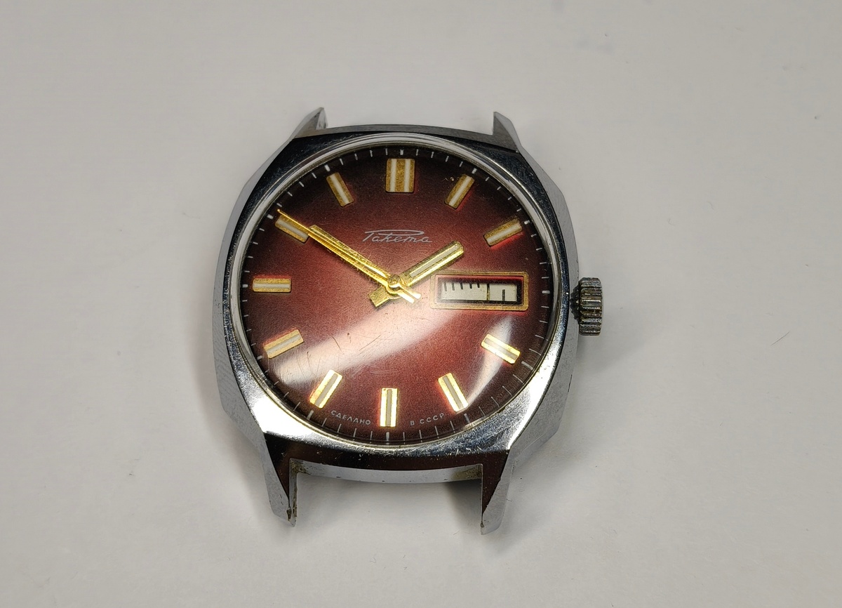 Доброго времени суток! Очередная Ракета 2627 от подписчика. Часы с двойным календарём и АПЗ. Как видно на фото календарь дней недели не работает как надо. Откручиваю заднюю крышку, первое впечатление хорошее - идут бодро, но есть люфт в секторе АПЗ. Циферблат в отличном состоянии. Снял мост АПЗ - здесь смазка, как солидол густая, такого быть не должно. Теперь надо с календарём разобраться, почему он не срабатывает. Фото не совсем точно передаёт, но вся внутренняя поверхность диска покрыта слоем масла, его здесь быть вообще не должно. Вот и причина неработающего календаря, диск просто не вращался как надо из за обильной смазки. Теперь её надо убрать и всё заработает. Поверхность моста календаря также покрыта слоем масла, тот кто делал эти часы ранее, недостатка в ГСМ явно не испытывал. А часы это не КПП авто, здесь масляная ванна не нужна. Теперь придётся все разбирать и убирать лишнюю смазку. На барабан также масла не пожалели. Замочил в бензине, надеюсь отмоет лишнее масло. После мо