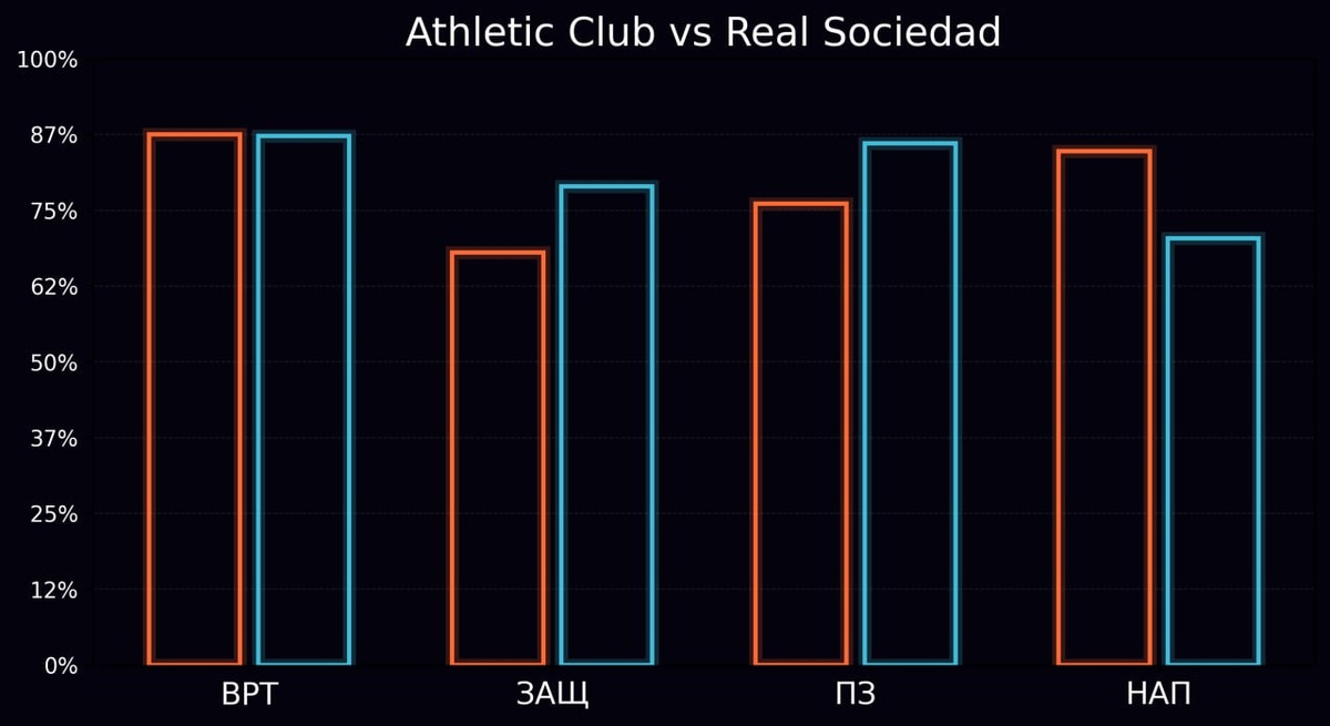 Сан-Мамес - место, которое превращает игру любой команды в тест на выдержку. Атлетик дома всегда добавляет за счёт темпа и трибун, но в таких матчах это часто про давление: вынудить соперника ошибиться первым. У Сосьедада - более “ровная” форма по сезону и меньше хаотичных матчей. Но дерби - это место, где стабильность проверяют не цифры, а нервы и контакт. Картина по метрикам Δ xF: -0,48 Tier C То есть матч почти равный, небольшой перевес у Сосьедада, но не настолько, чтобы гнуть линию в его сторону. Что это значит? Sociedad чуть выше по xF и SQB - в среднем команда выглядит собраннее и чуть качественнее по балансу. DPI (сопротивление давлению) почти равен - по темпу/давлению/интенсивности сильного перекоса нет. Обе команды сильны в обороне - базовый коридор матча низовой, пространство будет дорогим для обоих соперников. Атлетик по xF даёт “пилу” (посмотрите графики выше в соседнем посте), но держится в рабочем коридоре - команда может качнуться матчем, но не падает серией. Со