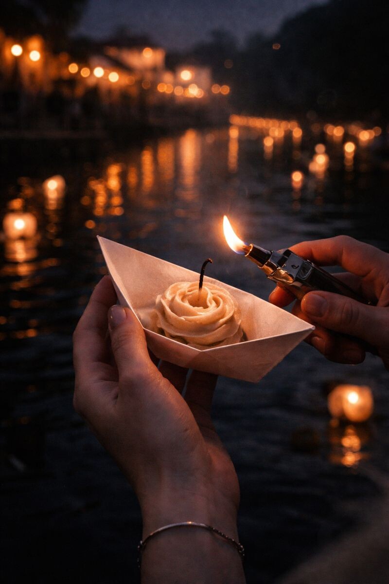 Ровно в одиннадцать началась церемония. Священник произнёс молитву. Люди, притихшие, с серьёзными лицами, стали подходить к воде. В руках у каждого была маленькая лодочка из коры или плотной бумаги, а в ней — свеча. Они зажигали фитиль, шептали имя, целовали лодочку и отпускали в тёмную воду.