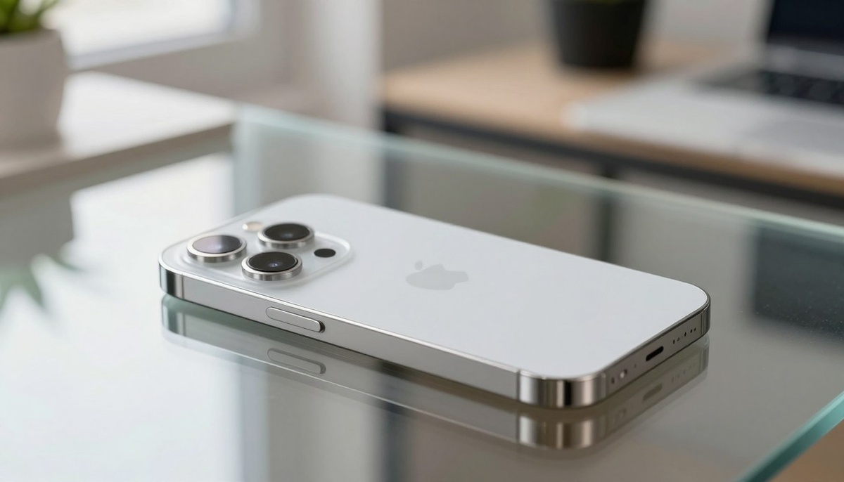 A sleek, silver iPhone 17 Pro is prominently displayed on a softly glowing table surface, highlighting its elegant design and ergonomic features. The phone is tilted at a slight angle, showcasing its smooth edges, vibrant display, and iconic camera layout. In the background, a blurred out ambient environment with soft, warm lighting, suggests a modern, minimalist workspace. The scene conveys a sense of sophistication and innovation, with the iPhone reflecting subtle reflections of ambient light. Use a shallow depth of field with a crisp focus on the phone while keeping the background softly blurred for a professional atmosphere. The overall mood is sleek and contemporary, enhancing the allure of the silver design.