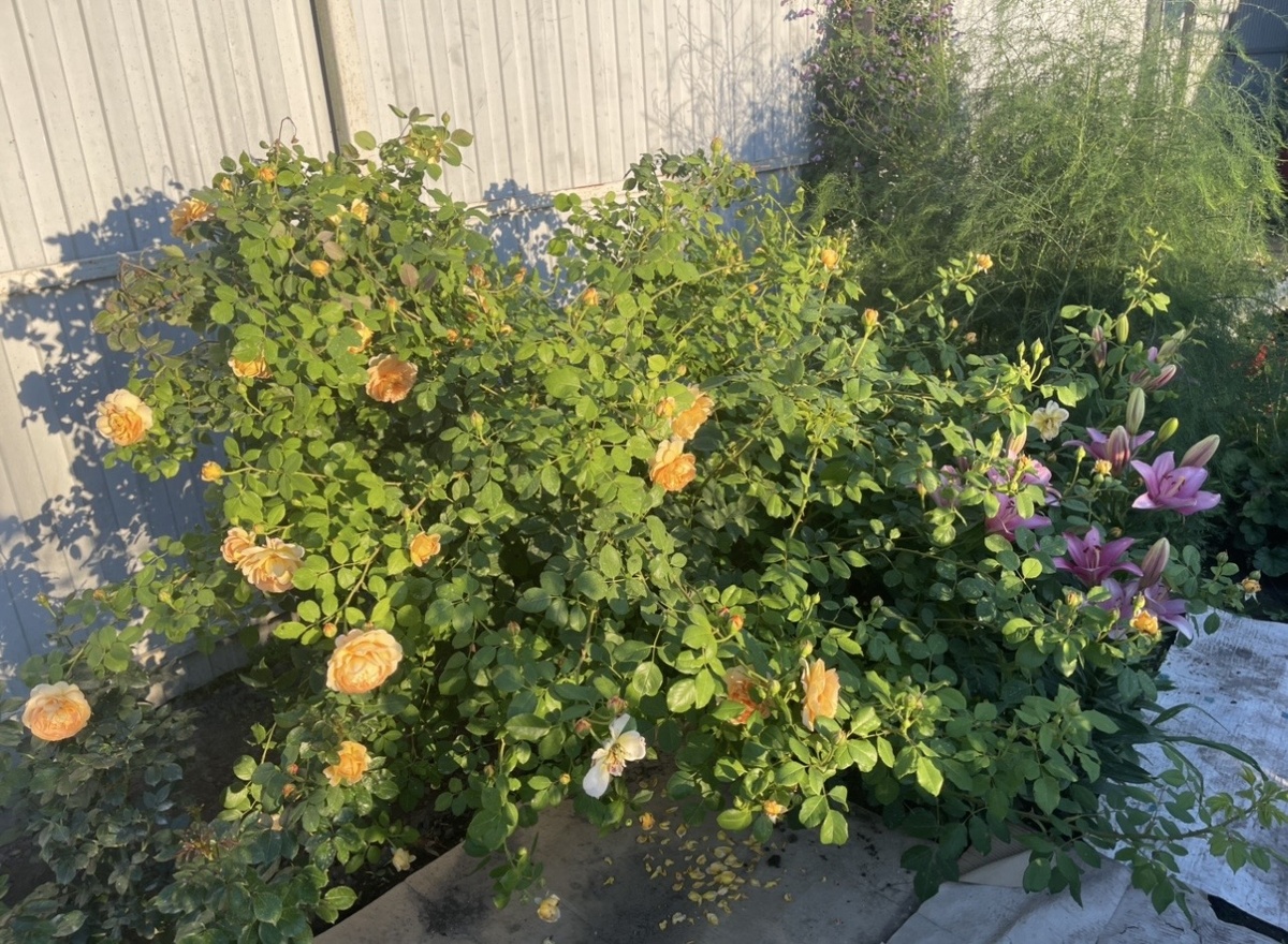 Вывод: смешанные посадки роз вдоль забора в узкой полосе - самая плохая идея. Розарий убрала. Теперь там туи растут.