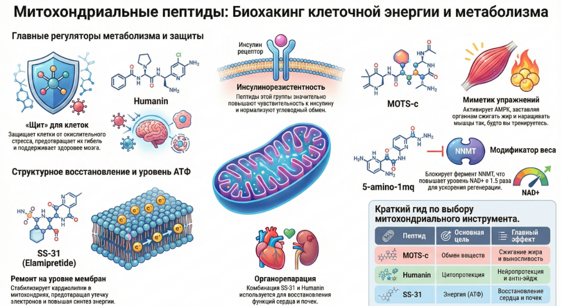 Митохондриальные пептиды — это инновационный класс биомолекул, кодируемых собственной ДНК митохондрий, которые играют роль ключевых регуляторов метаболизма, клеточного выживания и долголетия. В биохакинге их рассматривают как инструменты для оптимизации работы «энергетических станций» клеток, замедления системного старения и восстановления тканей на субклеточном уровне. Ниже приведен обзор трех наиболее значимых пептидов этой группы: MOTS-c является мощным регулятором обмена веществ, действие которого имитирует эффекты от интенсивных тренировок. Гуманин известен своими защитными функциями и способностью поддерживать жизнеспособность клеток в условиях стресса. SS-31 обладает уникальным механизмом действия, направленным на физическое укрепление структуры митохондрий. Для достижения максимального антивозрастного эффекта в биохакинге часто используют стеки митохондриальных пептидов: Практические рекомендации: Получить консультацию по пептидам https://taplink.cc/annymalysh